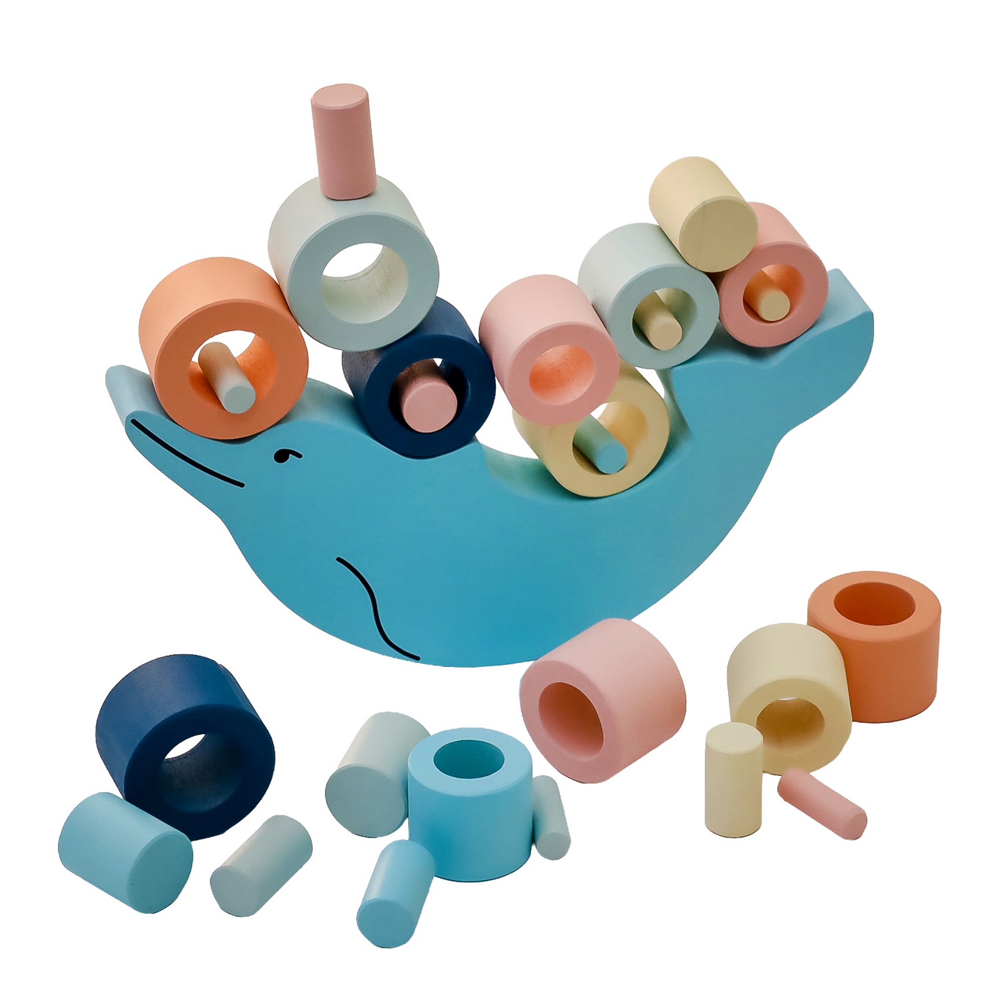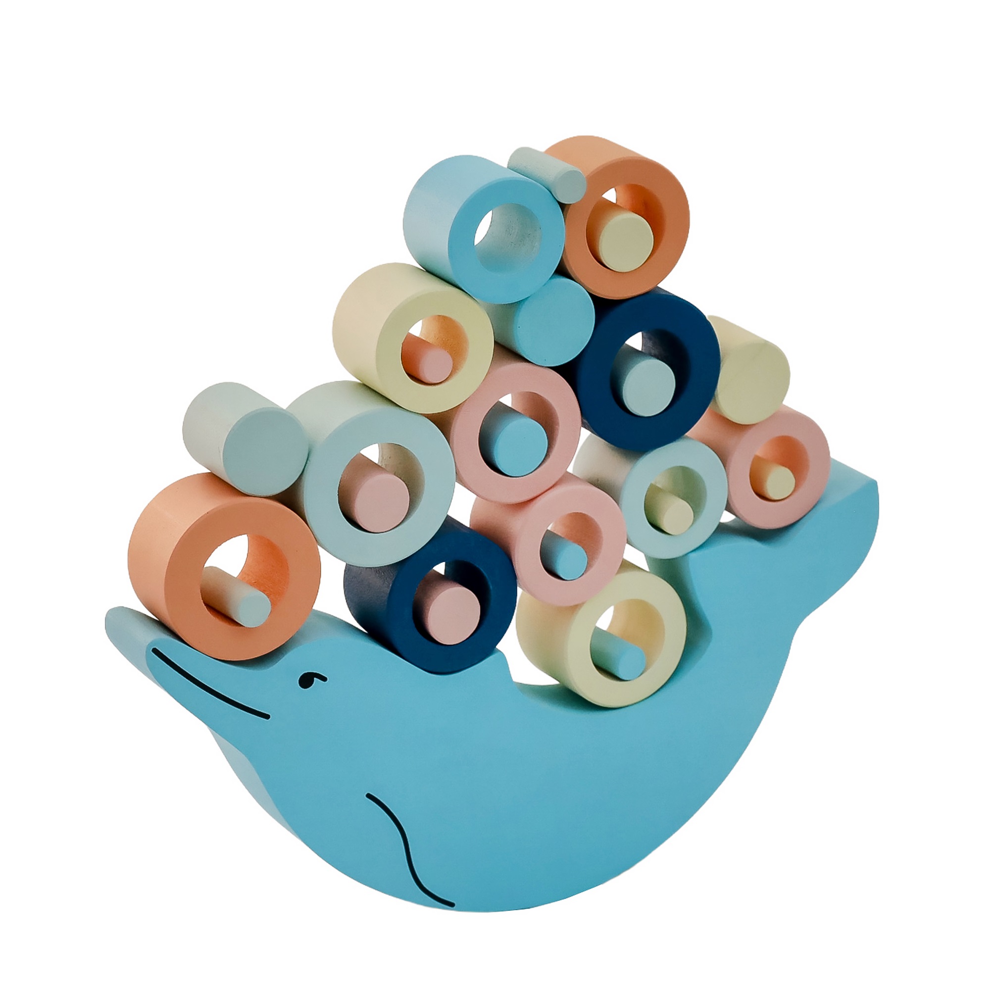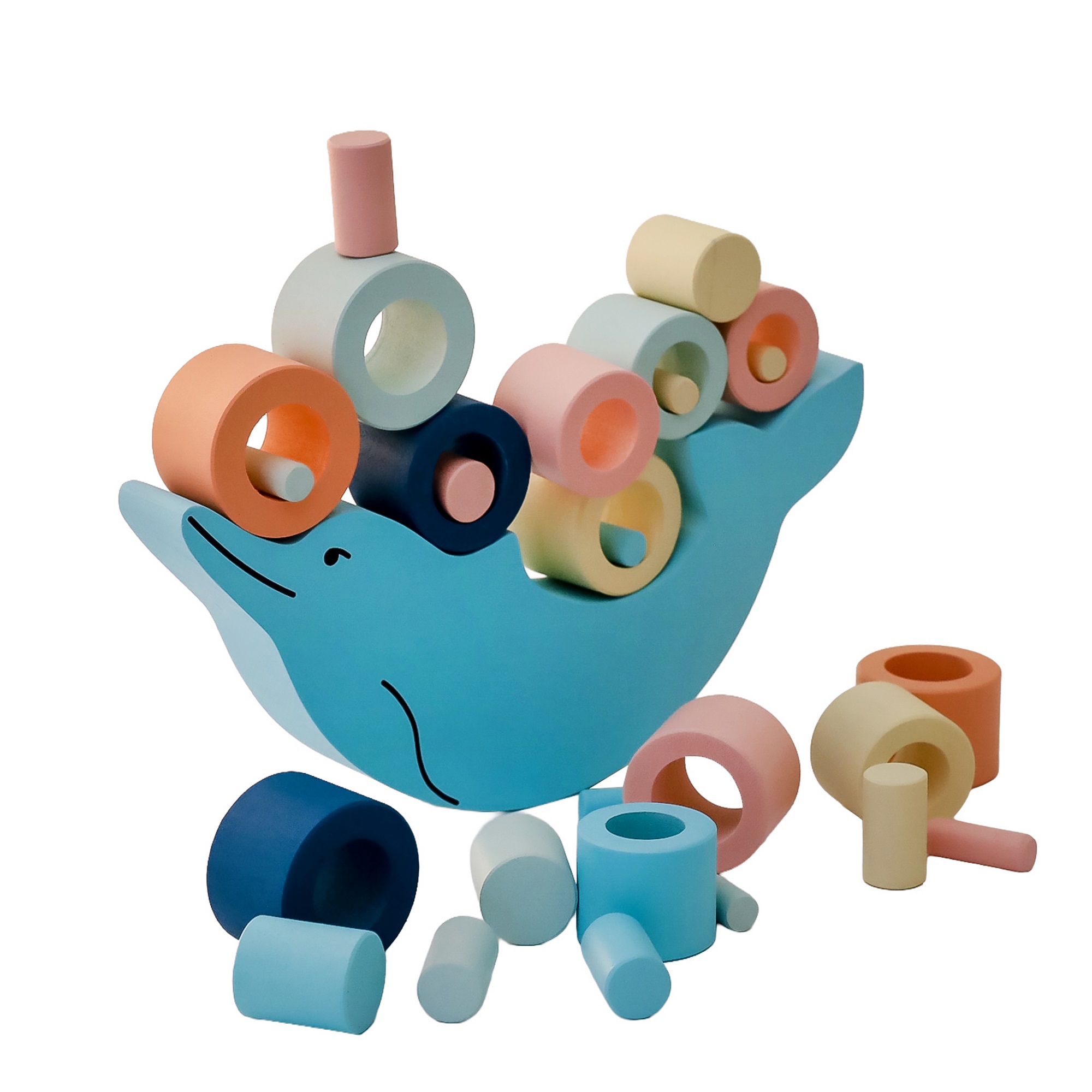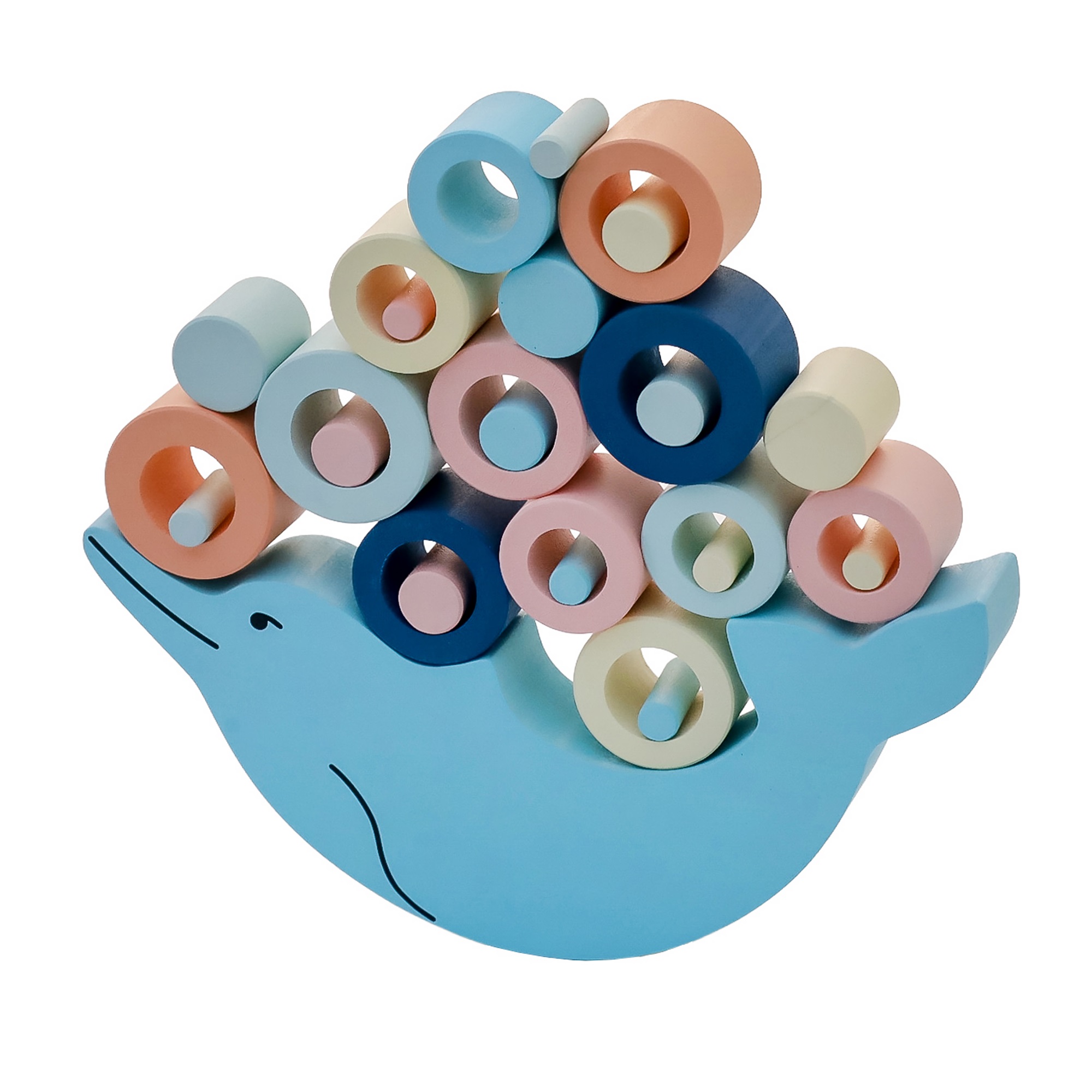 Balancing Funny Dolphin – is made of carefully grown and slowly dried linden wood, coated with safe, water-based paints. When you take the piece in your hand, you will see that the texture of natural wood shows though the paint. The unique and beautiful feature of all the toys is the velvety-rough surface, perfect for stacking and balancing. This finish is acquired by the use of a non toxic water based colour stain, which penetrates into the wood leaving a rich matte finish thus preserving the natural qualities and natural markings of each unique piece of wood. Play the Dolphin Balance Game and make sure that the dolphin does not fall over when you place the brightly colored shapes and blocks on it. But be careful that the dolphin doesn’t lose its balance! This wooden balance toy in the shape of a Dolphin is a perfect learning toy for your little one. It will help your child to develop gross and fine motor skills, hand-eye coordination, patience, counting skills, analysis skills and encourages concentration.