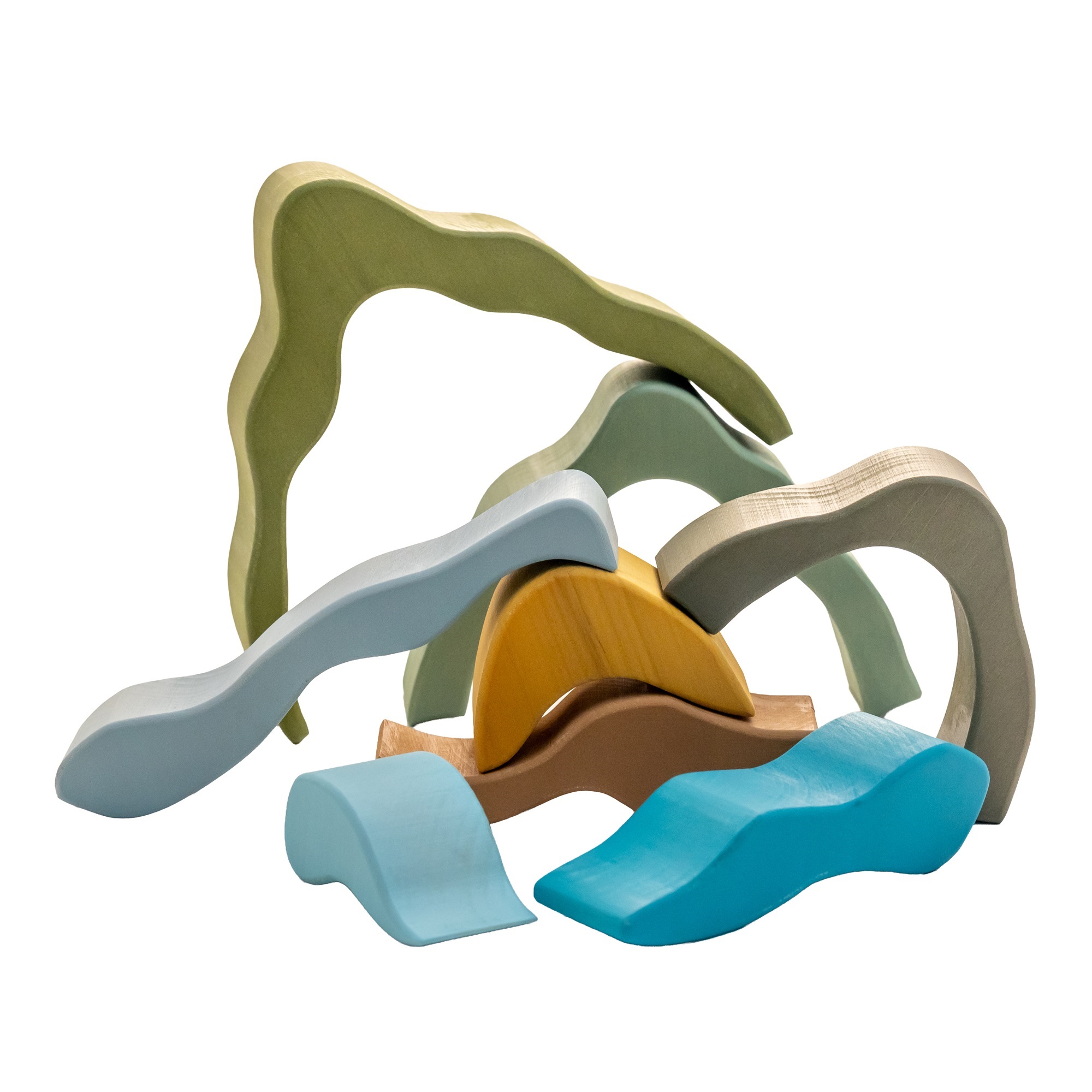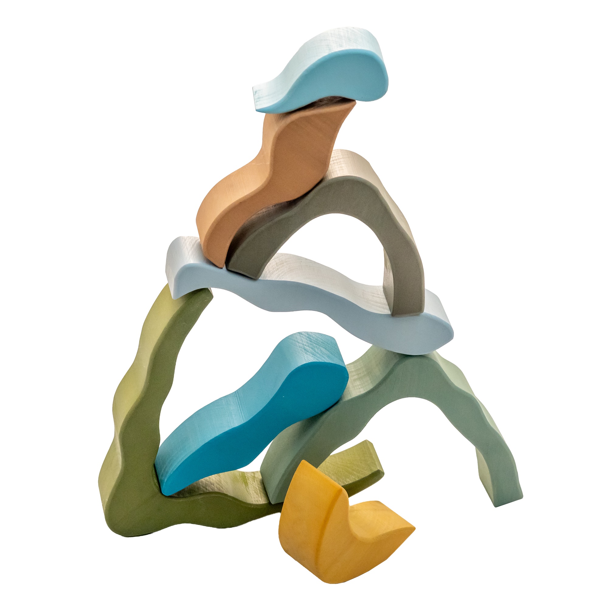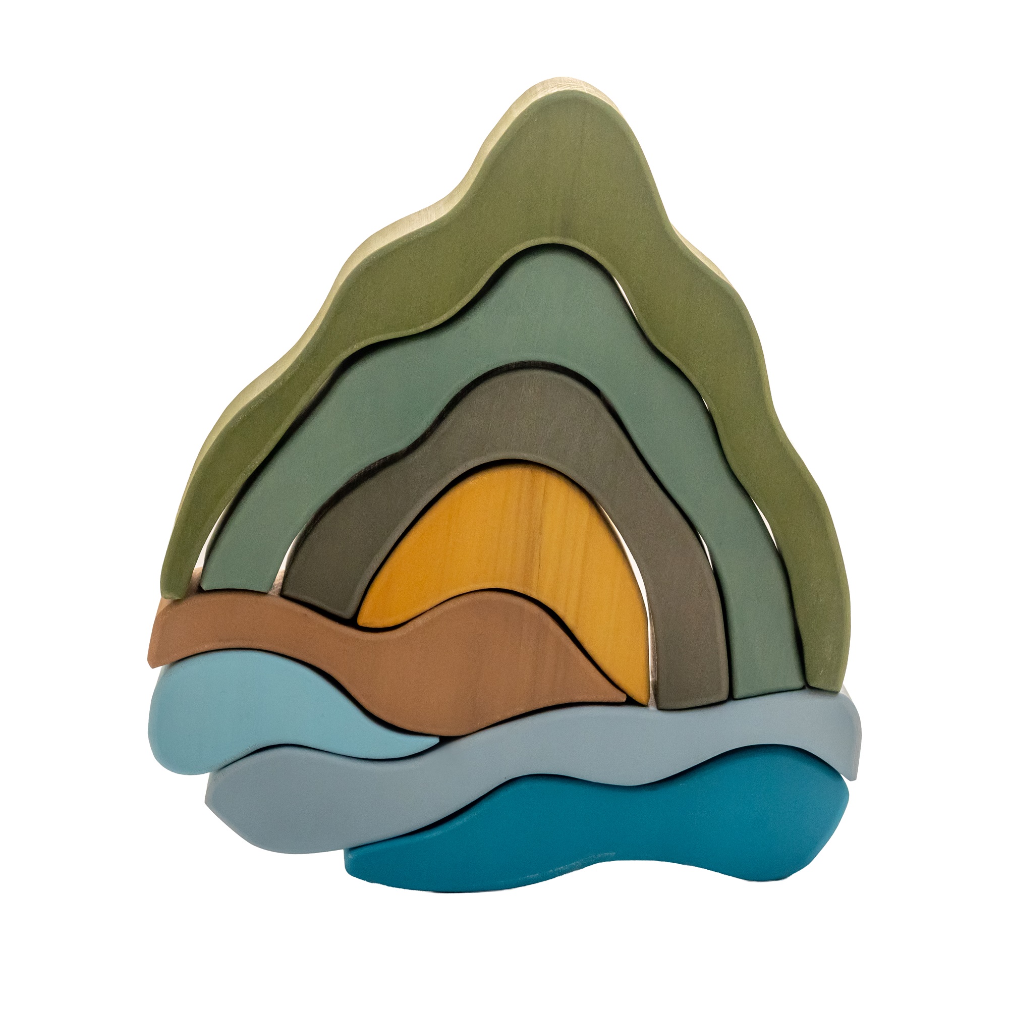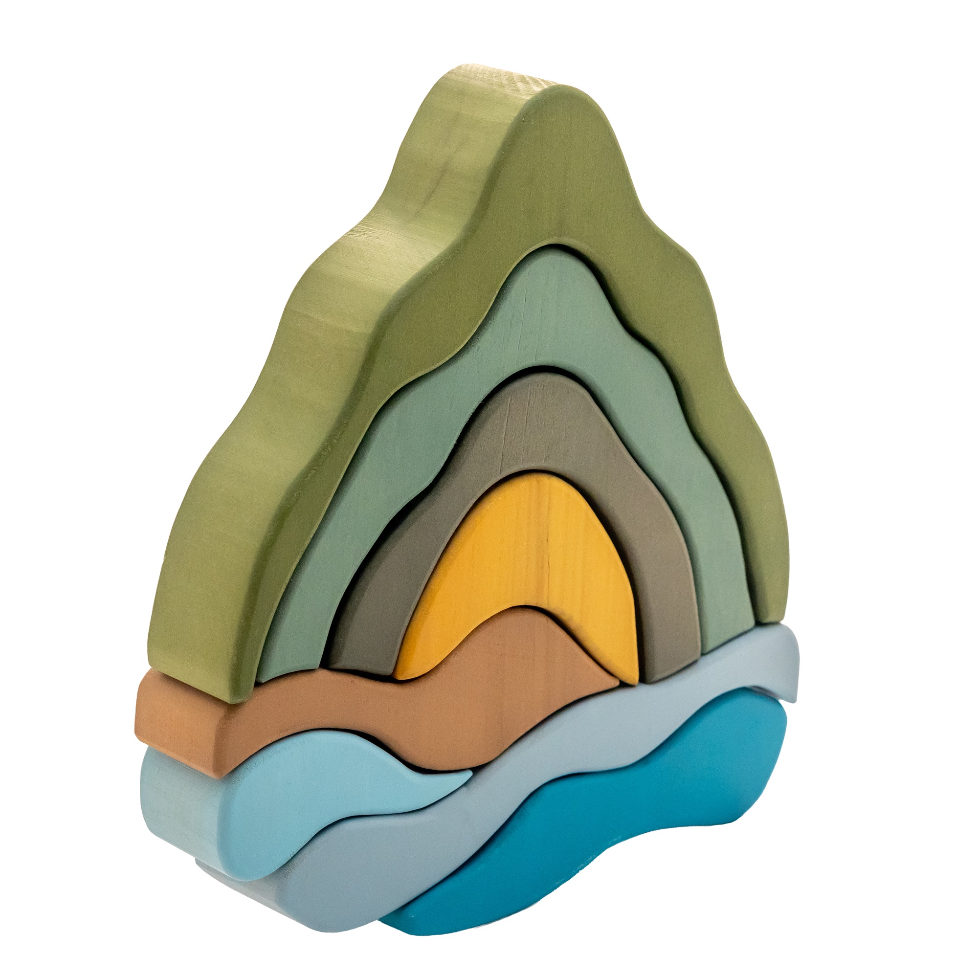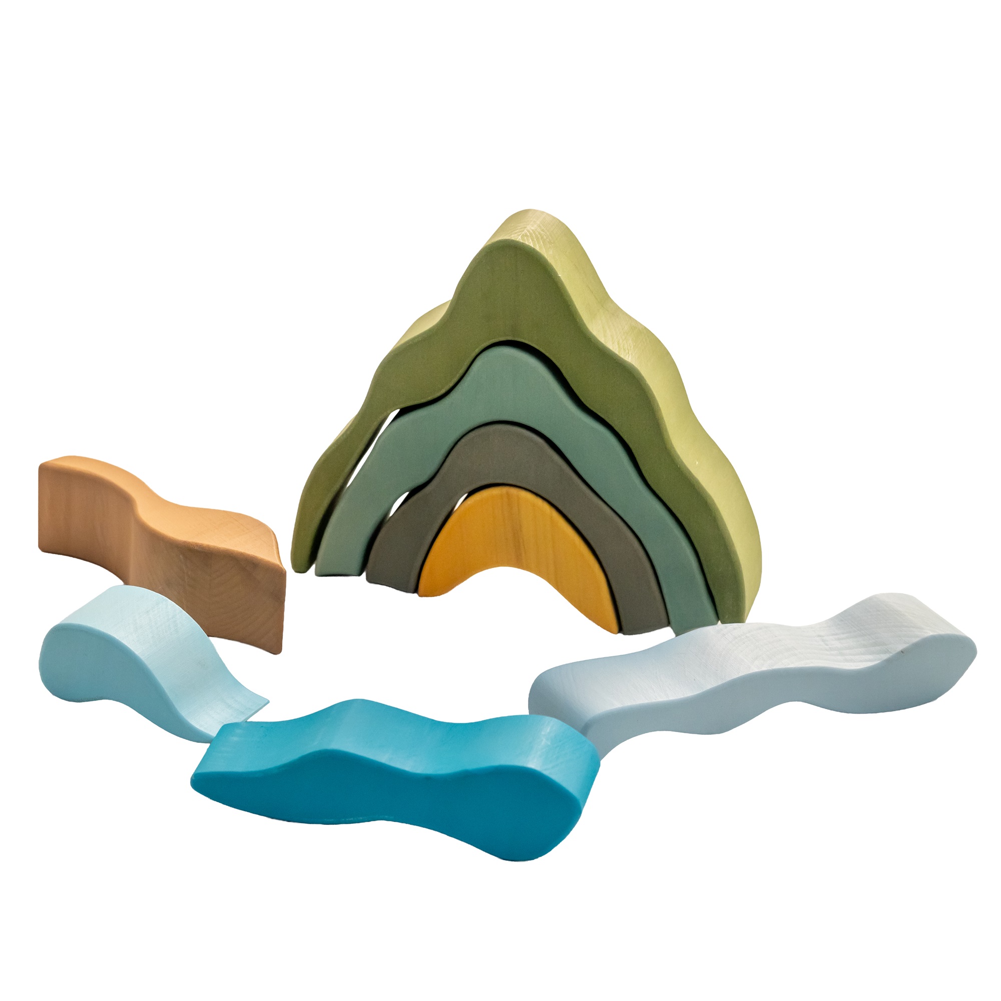Гора і Річка – надзвичайно гарна серія сучасних, креативних, крафтових  іграшок, що не залишить байдужими дітей та їх батьків. Виготовлена з м’якої породи дерева, пофарбована спеціальними матеріалами для дитячих іграшок, що не створюють плівки на поверхні, завдяки чому на дотик іграшка тепла та складає враження оксамитової. Незвична, унікальна пірамідка розвиває зорово-моторну координацію, логічне та творче мислення, концентрацію уваги та запам’ятовування, правильне сприйняття кольору та тону, допомагає засвоїти поняття більше-менше. Відповідає концепціі Вальдорфського виховання.