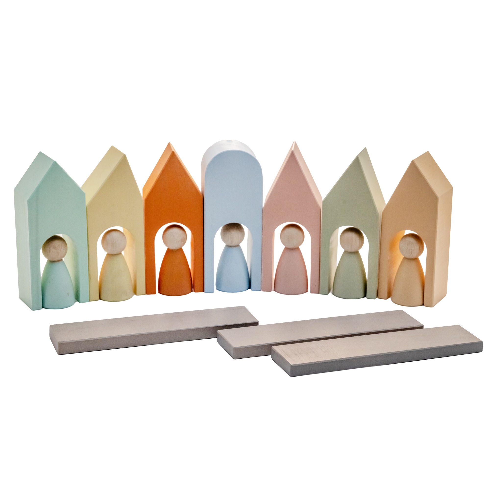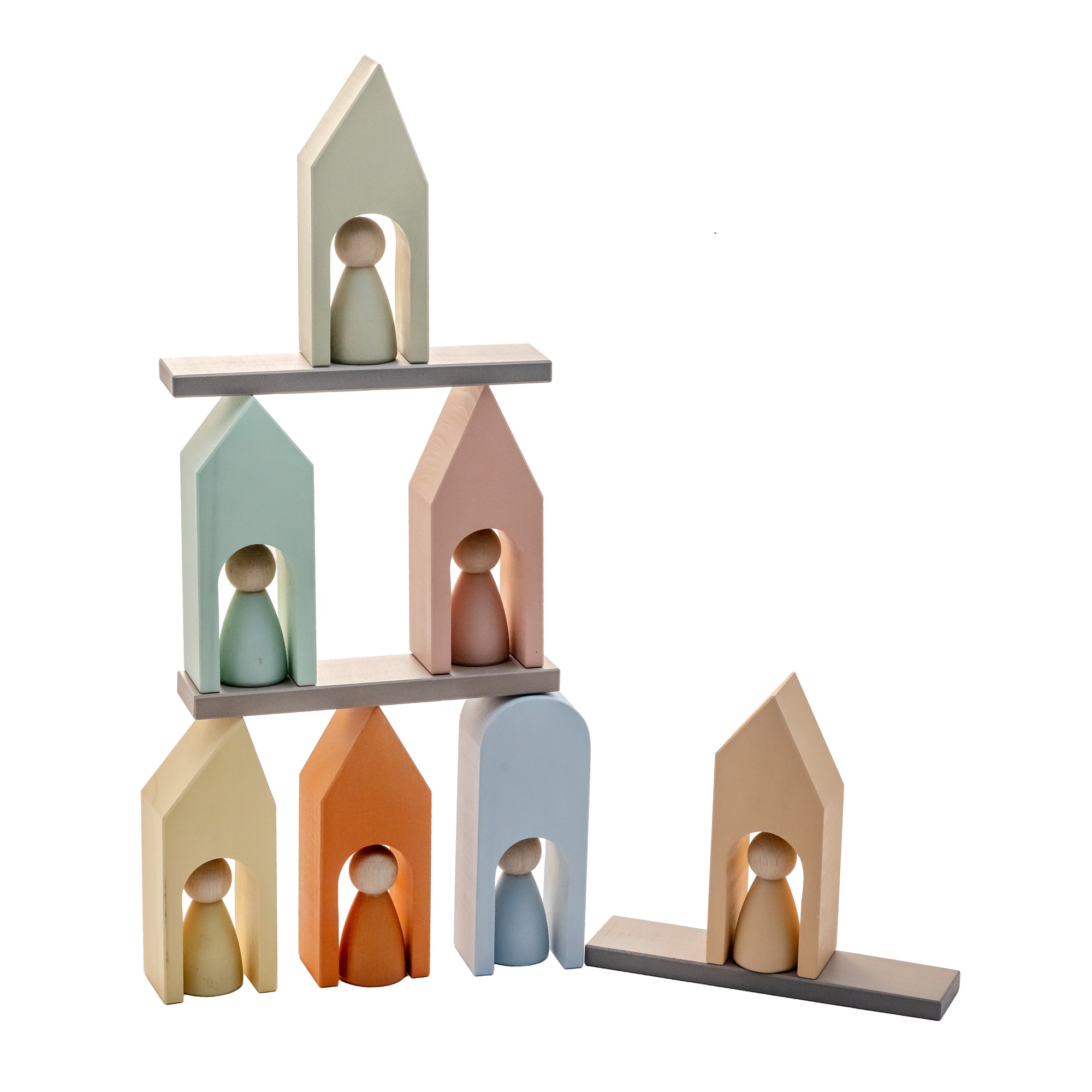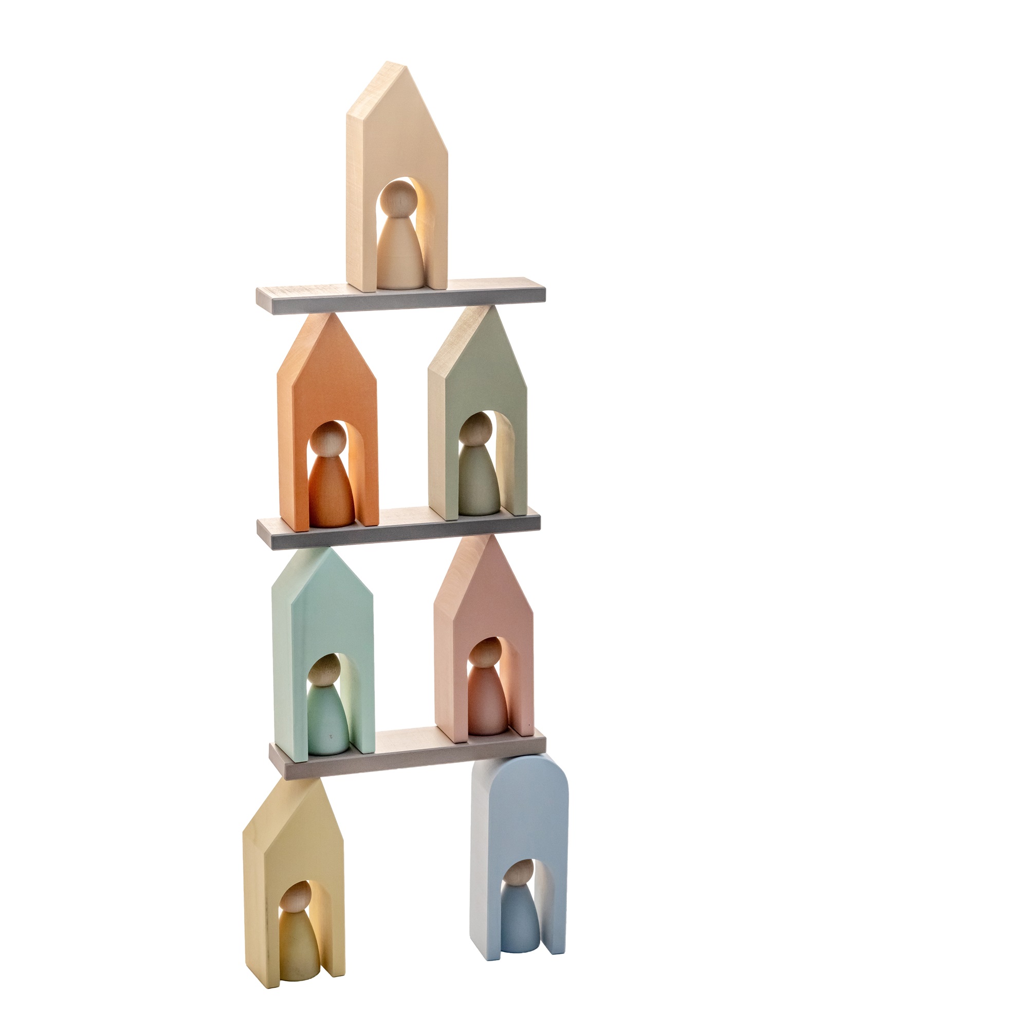 Містечко семи друзів в пастельних тонах – надзвичайно гарна серія креативних, cучасних, крафтових, європейських іграшок, що не залишить байдужими дітей та їх батьків. Виготовлена з м’якої породи дерева, пофарбована спеціальними пастельними матеріалами для дитячих іграшок, що не створюють плівки на поверхні, завдяки чому на дотик іграшка тепла та складає враження оксамитової. Гра допоможе вивчити відтінки та кольори, покращити сенсомоторну координацію рухів, вдосконалити систему”око-рука”, гнучкість кисті, окомір, посидючість, концентрацію уваги, розвиває фантазію та уяву. Великий розмір деталей гри, чудово підходить для діток раннього віку. Відповідає вимогам Вальдорфськоі освіти.