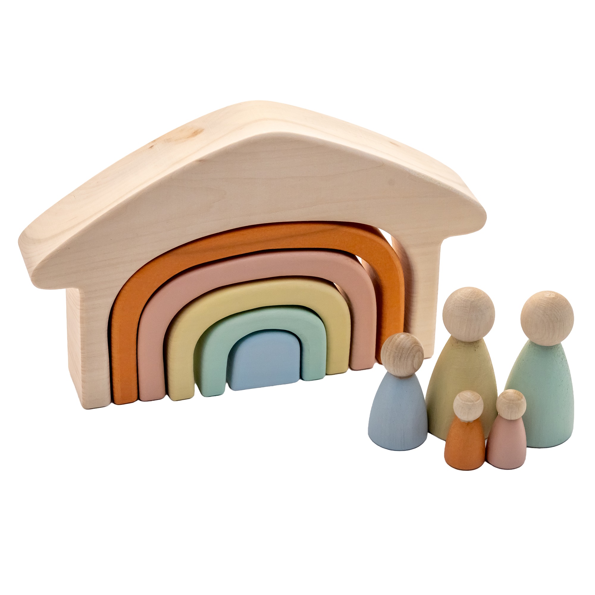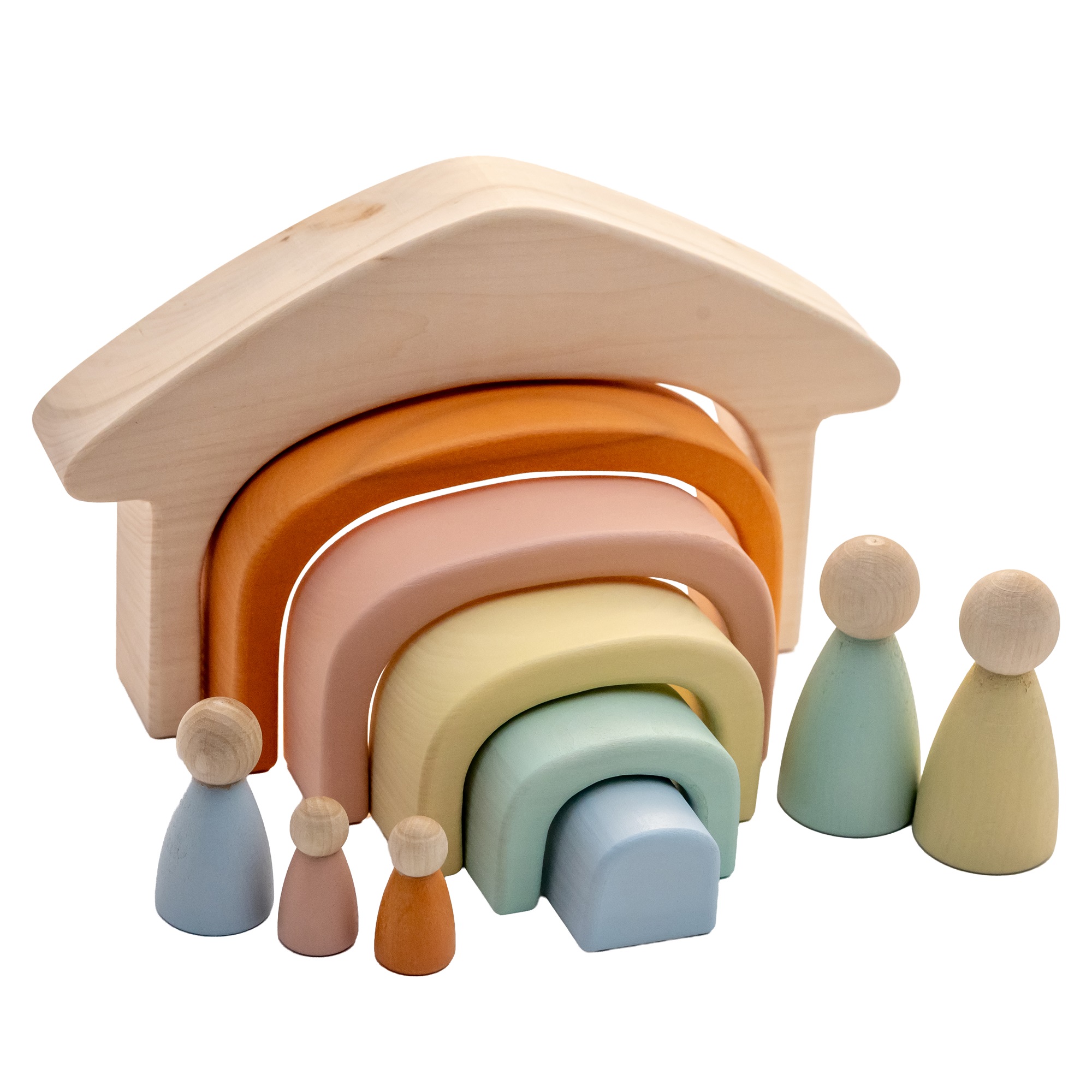 Веселка “Сім’я” в пастельних тонах – надзвичайно гарна серія сучасних, креативних іграшок. Виготовлена з м’якої породи дерева, пофарбована спеціальними матеріалами для дитячих іграшок, що не створюють плівки на поверхні, завдяки чому на дотик іграшка тепла та складає враження оксамитової. Вдале поєднання чоловічків, дуг та будиночку створює багато можливостей для розвитку уяви, мислення дитини, що відповідає принципам вальдорфськоі педагогіки.